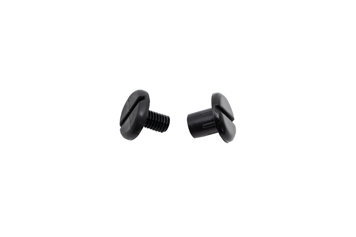Black, plastic replacement screw for a sewn termination with a red sleeve.